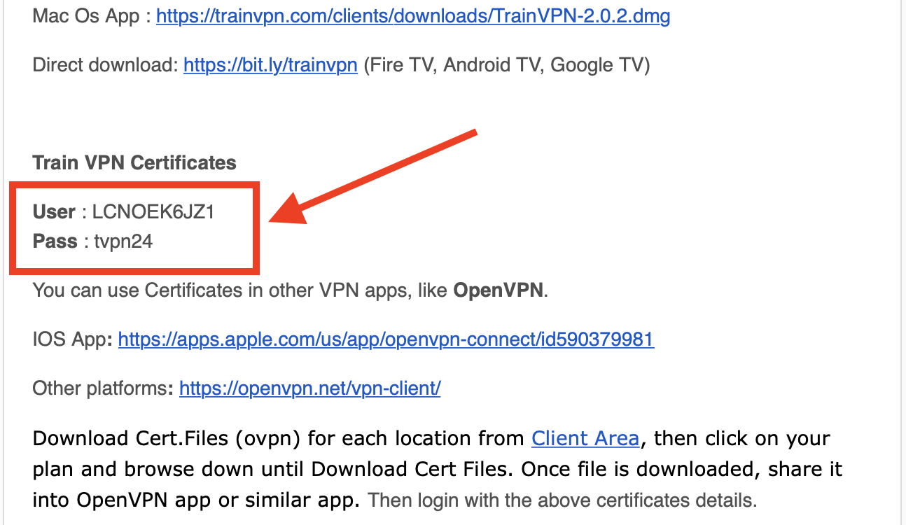 Luego de obtener el plan en TrainVPN, el user y pass de certificado los recibirá en su email.