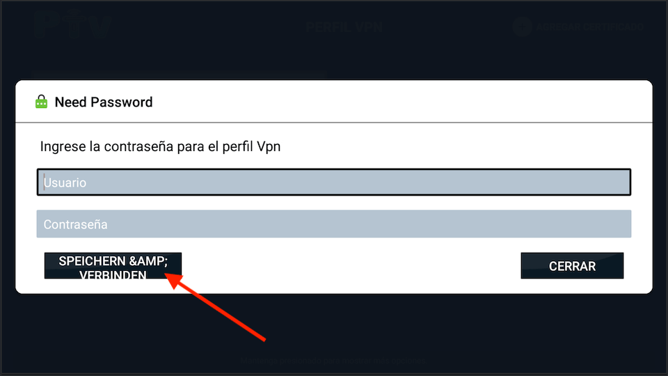 5. Ingrese su user y pass de certificado de TrainVPN y presione el botón de la izquierda para conectarse.